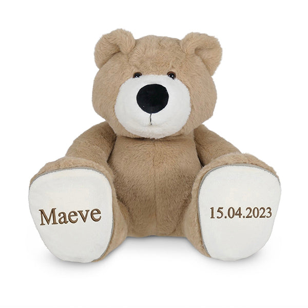 Geboortebeer met naam en geboortedatum geborduurd