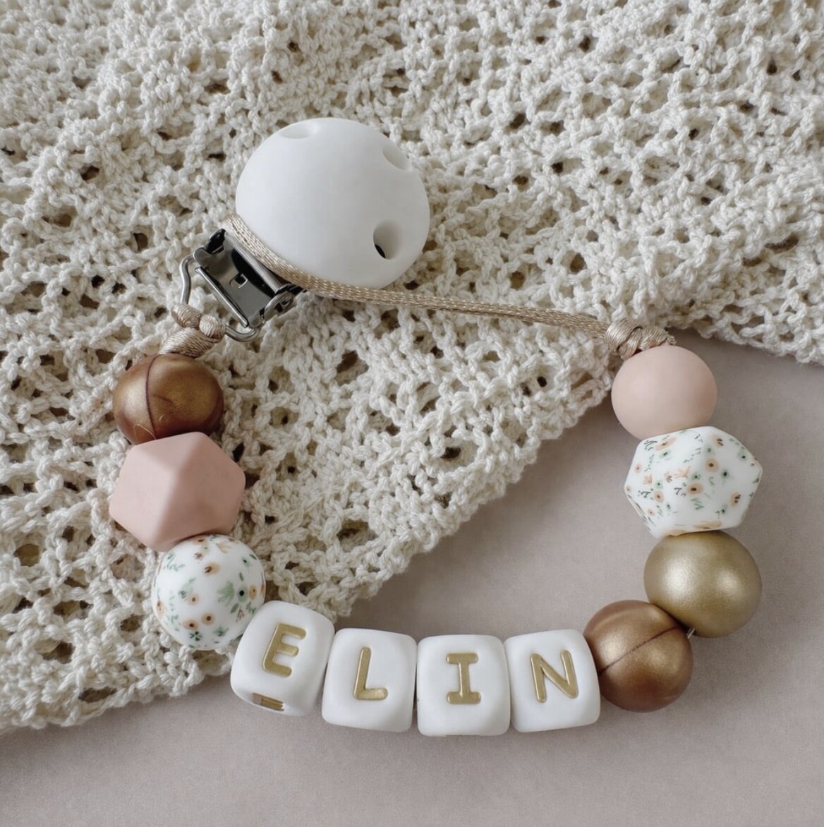 Wij bieden een speenkoord met naam aan met 13 verschillende kleuren letterkralen. Je hebt de keuze uit: